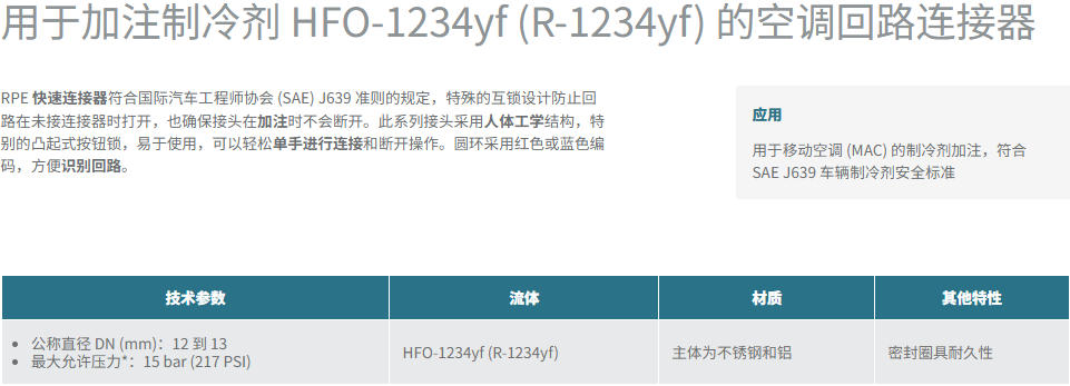 史陶比尔RPE系列连接器在HFO-1234yf制冷剂加注场景的应用,核心价值在于兼顾环保合规、操作效率与运行安全。在政策驱动制冷剂替代转型的背景下,其符合行业标准的设计可助力车企与维修网点快速适配新介质,避免合规风险。