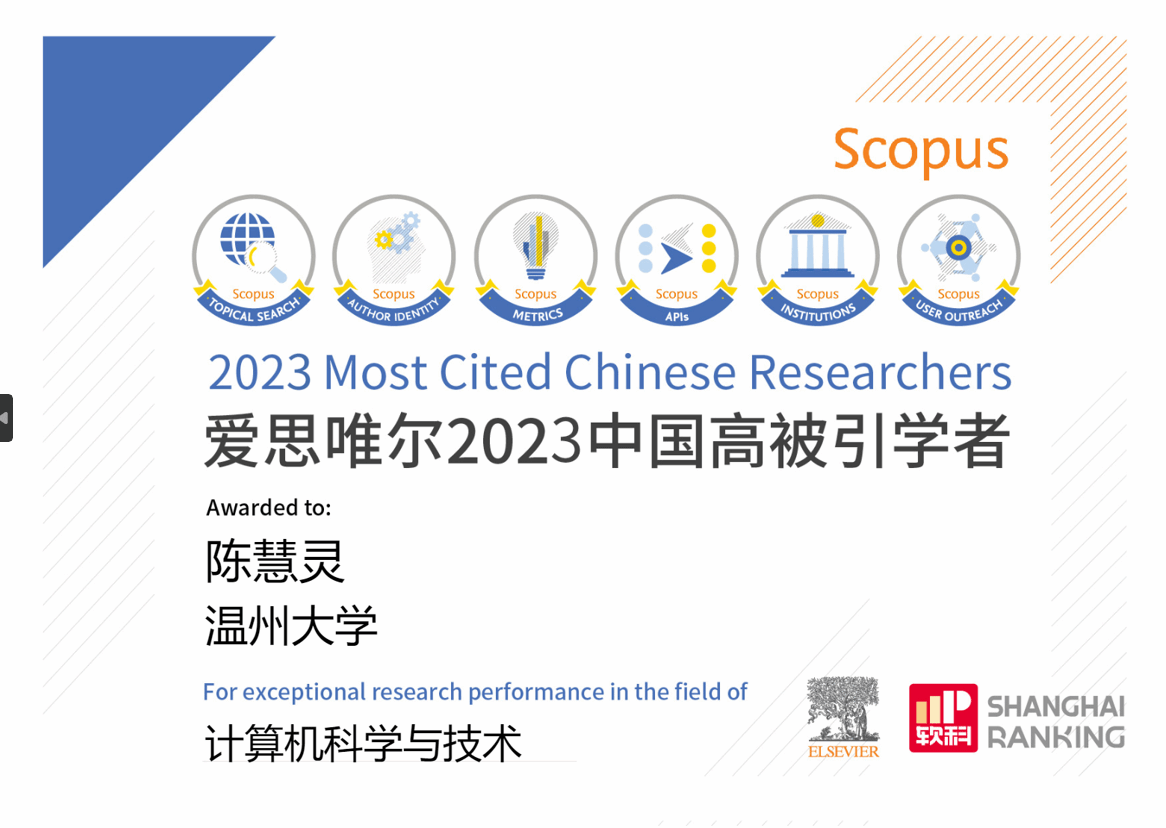 2024年3月27日,爱思唯尔(Elsevier)发布2023“中国高被引学者”(Highly Cited Chinese Researchers)榜单。此榜单以Scopus数据库作为中国学者科研成果的统计来源,采用上海软科教育信息咨询有限公司开发的方法。beat365在线唯一官网陈慧灵教授入选2023“中国高被引学者”榜单(计算机科学与技术学科)。