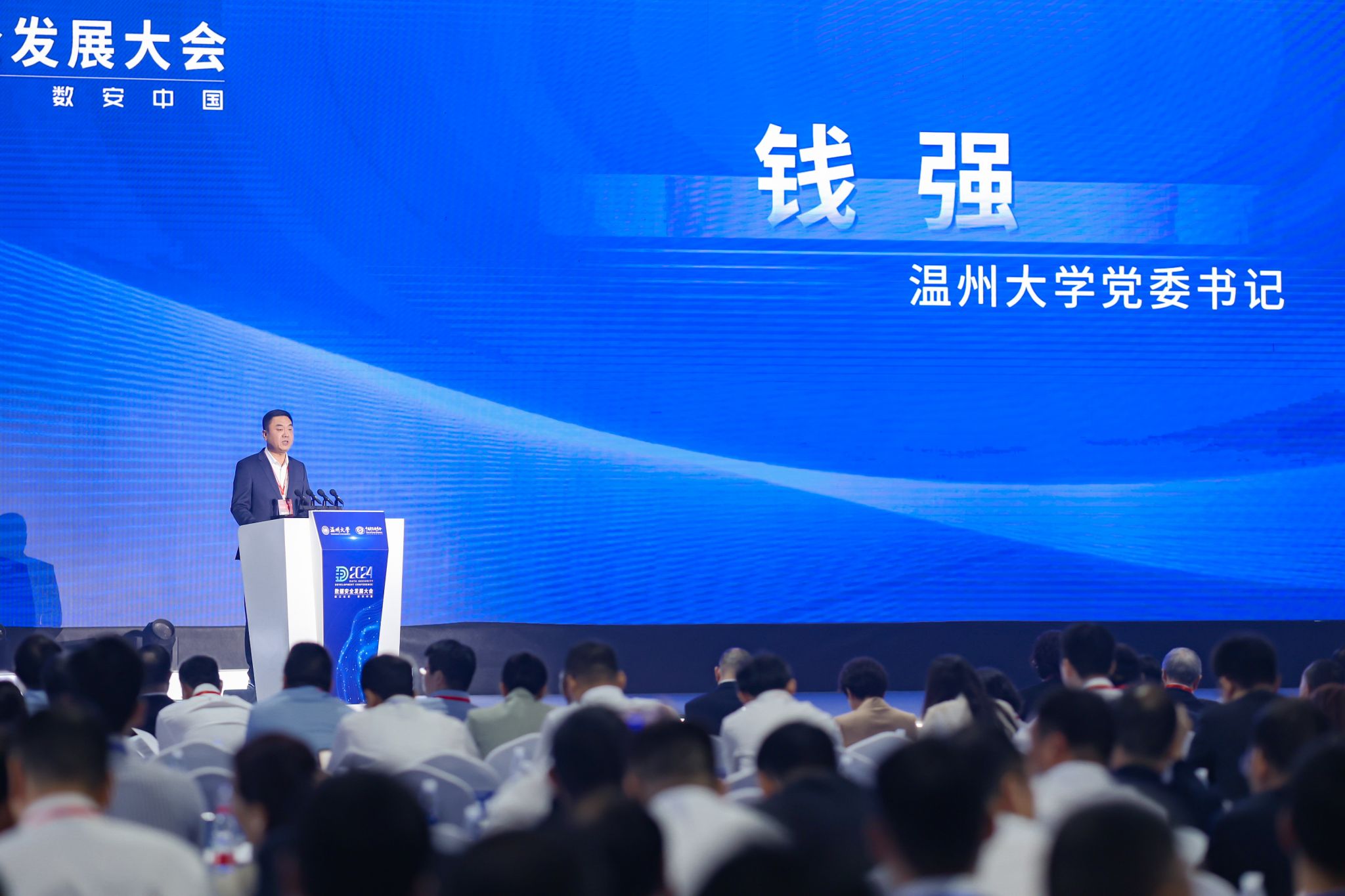 钱强在致辞时表示,当今时代,数字经济已经成为新一轮科技革命和产业革命的战略选择。温州大学服务国家战略、聚焦地方所需,与数安港共建温州数据研究院、数据工程师人才培养基地,与龙头企业共建省重点产业学院,为数安港提供人才和技术支持。期待以此次大会成功举办为契机,进一步深化科学研究,推动创新突破,加快数字领域制度建设、技术攻关,为筑牢数字安全屏障、服务数字中国战略贡献智慧力量。