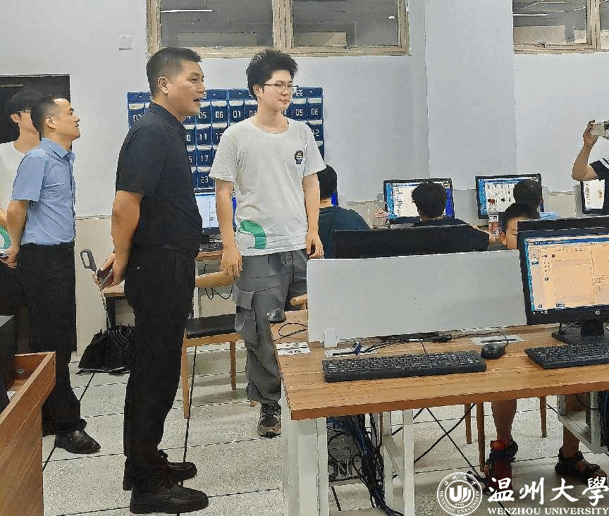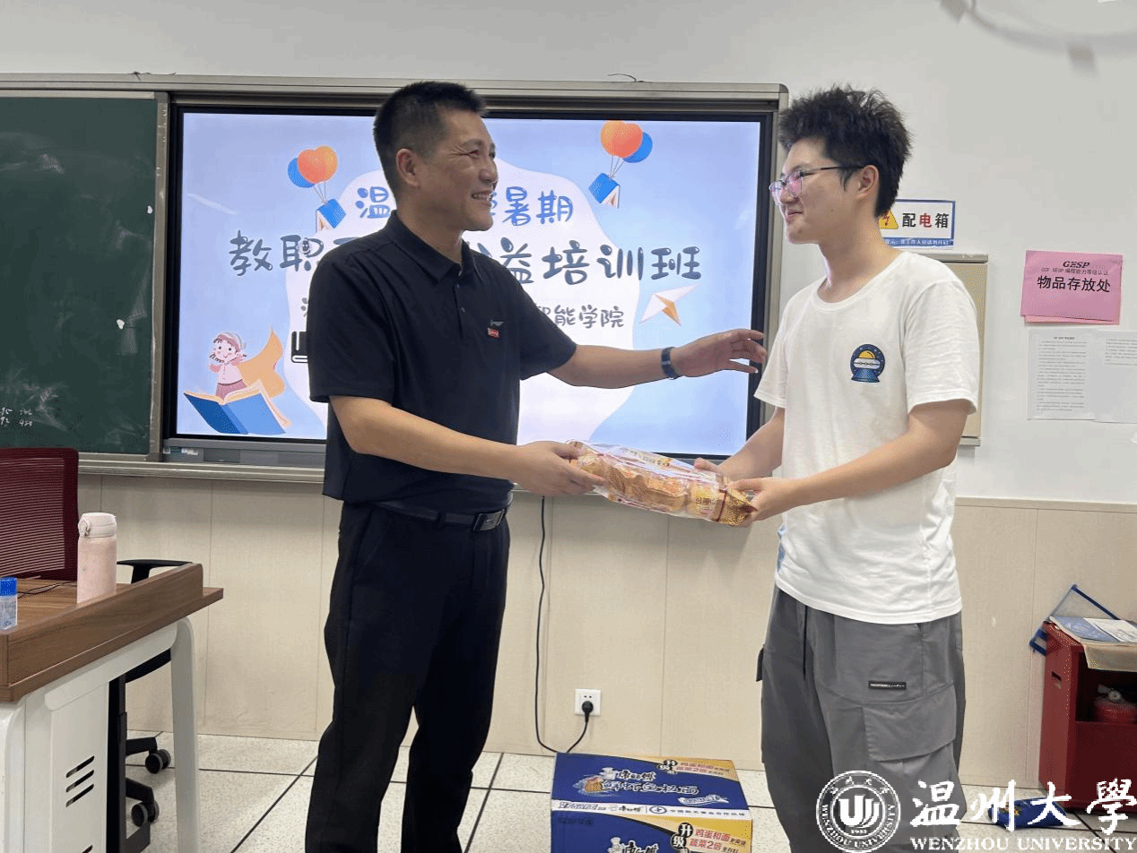 2024年7月8日下午,温州大学工会主席孙安梭一行亲临现场,向辛勤付出的师生们表达了深切的关怀。在现场,孙主席与实践队成员亲切交谈,了解到实践队队员利用自身专业优势,精心设计了适合各年龄段孩子的课程内容,从基础的编Scratch趣味编程培训课到趣味编程项目实践,让孩子们在轻松愉快的氛围中感受编程的魅力。孙主席向实践队队员们传达了学校工会对这次活动培养和锻炼孩子逻辑能力的高度重视和大力支持,同时也强调了安全问题,提醒实践队成员要时刻关注孩子们的安全,确保活动顺利进行。最后孙主席代表学校工会向“ACE计划”暑期实践队派发了慰问品,与参与本次培训的全体成员合影留念。