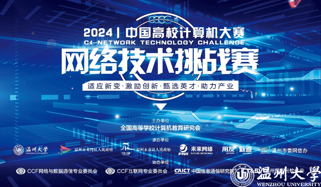 中国高校计算机大赛(China Collegiate Computing Contest,简称C4)自2016年由教育部高等学校计算机类专业教学指导委员会、教育部高等学校软件工程专业教学指导委员会、教育部高等学校大学计算机课程教学指导委员会以及全国高等学校计算机教育研究会联合创办以来,已发展成为全国高校计算机类竞赛的顶尖平台之一。作为C4的八大竞赛之一,“网络技术挑战赛”自2017年起由温州大学承办,至今已成功举办八届,逐渐成为国内网络技术创新领域的重要赛事。