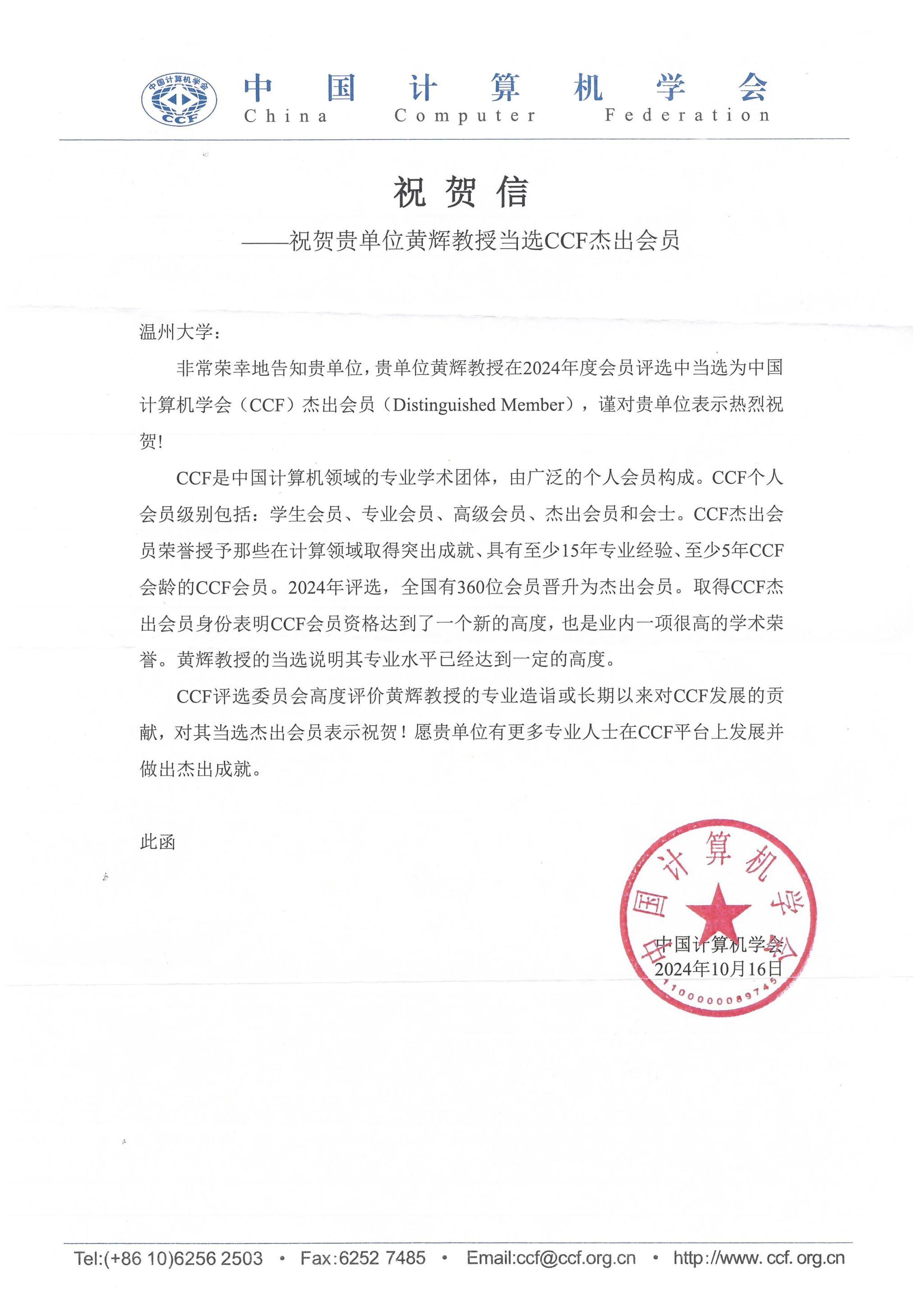 近日,中国计算机学会(CCF)发来贺信,祝贺beat365在线唯一官网黄辉教授当选中国计算机学会(CCF)杰出会员(Distinguished Member)。