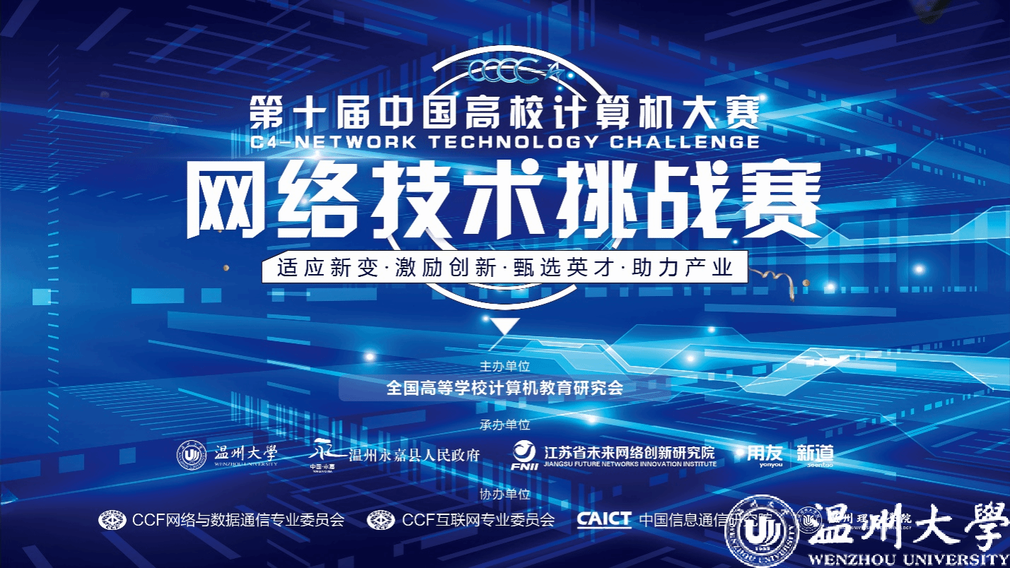“C4-网络技术挑战赛”自2017年起一直由组委会主任单位温州大学承办。本年度,共同承办单位包括了温州永嘉县人民政府、江苏省未来网络创新研究院、用友新道科技有限公司,同时得到了CCF网络与数据通信专业委员会、CCF互联网专业委员会、中国信息通信研究院和温州理工学院等协办单位的支持。