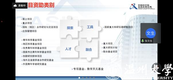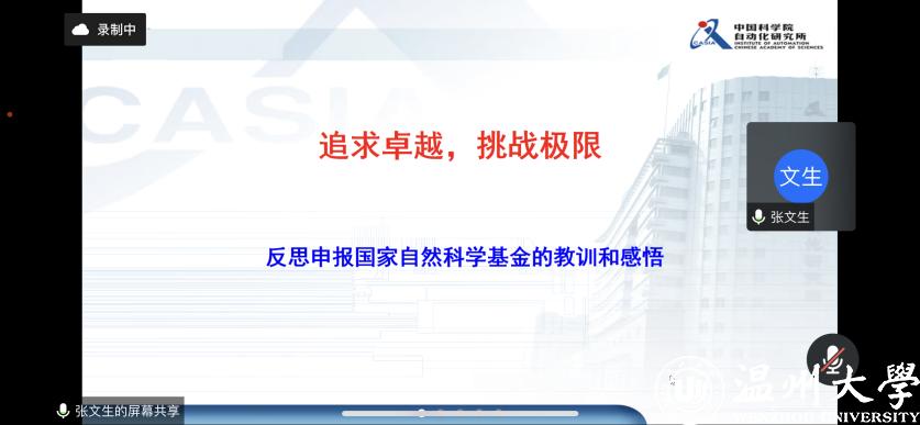 2022年11月30日下午3点半,beat365在线唯一官网邀请了中科院自动化所张文生教授作题为“追求卓越,挑战极限”的讲座,主要分享张教授其本人关于国家自然科学基金项目(以下简称国自然项目)申报和评审方面的经验。讲座由陈慧灵副院长主持,相关专业的老师、青年博士和硕士研究生共计40余人聆听了本次讲座。因疫情防控需要,讲座以线上线下相结合的形式展开。