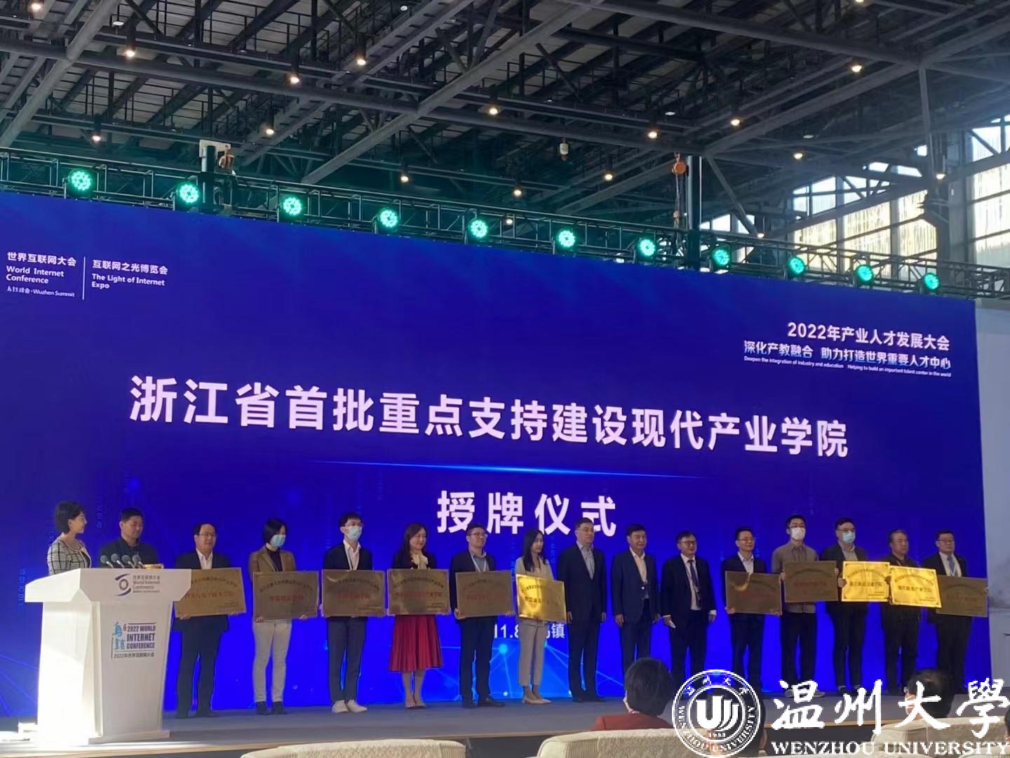 近日,由浙江省委人才办指导,浙江省经济和信息化厅、浙江省教育厅联合主办的2022年产业人才发展大会在乌镇互联网国际会展中心举行。浙江省委人才办专职副主任张旭明、浙江省经济和信息化厅一级巡视员吴君青、浙江省教育厅总督学舒培冬等出席活动并为入围浙江省首批重点支持建设现代产业学院名单的21家现代产业学院授牌。beat365在线唯一官网副院长黄辉参加会议并代表浙南数字经济产业学院接受授牌。