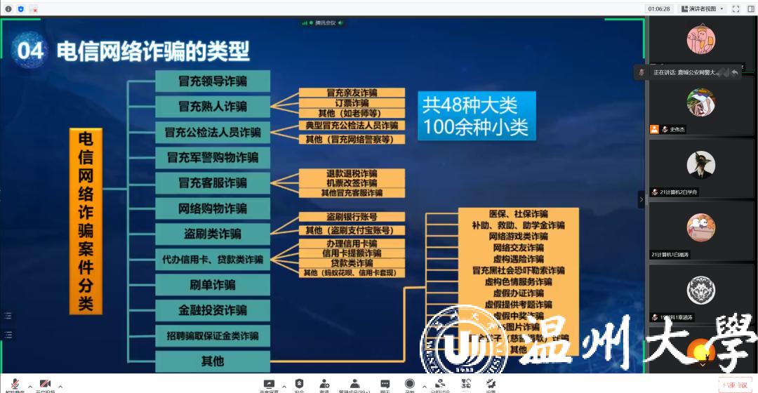 为增强beat365在线唯一官网学子安全防范意识,筑牢网络安全防线,提高反诈骗应对能力。2022年5月11日晚19点,beat365在线唯一官网于腾讯会议上举行了2022年校友思享会——揭下网络黑灰产“画皮”与“套路”,力保“触网”安全。本次思享会由学院辅导员叶桦畅老师主持,并有幸邀请到十佳爱民警察、温州市公安局鹿城区公安分局网警大队包长昕警官与beat365在线唯一官网300余名学生漫谈安全用网。