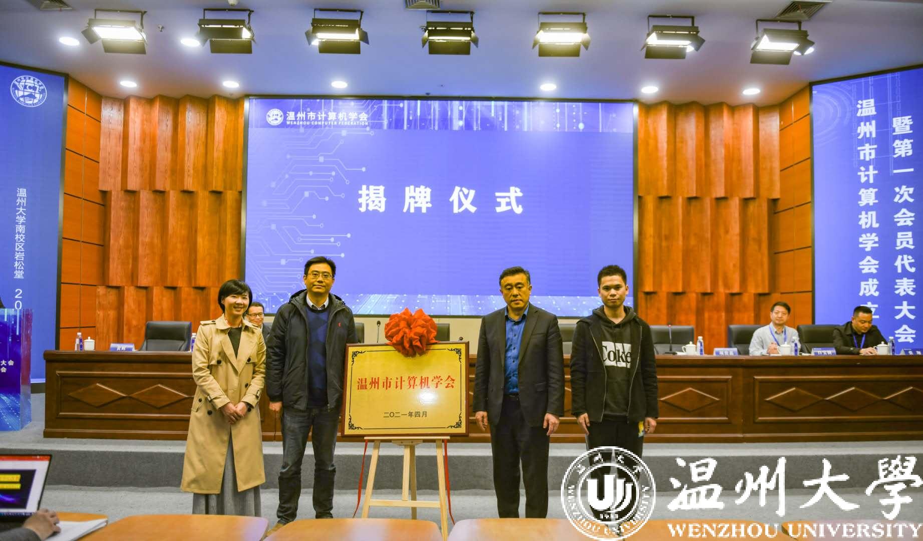 大会举行隆重的揭牌仪式,省计算机学会秘书长肖俊、市科协副主席章秀伟、温州大学副校长薛伟、市民政局项佳磊共同为温州市计算机学会揭牌。