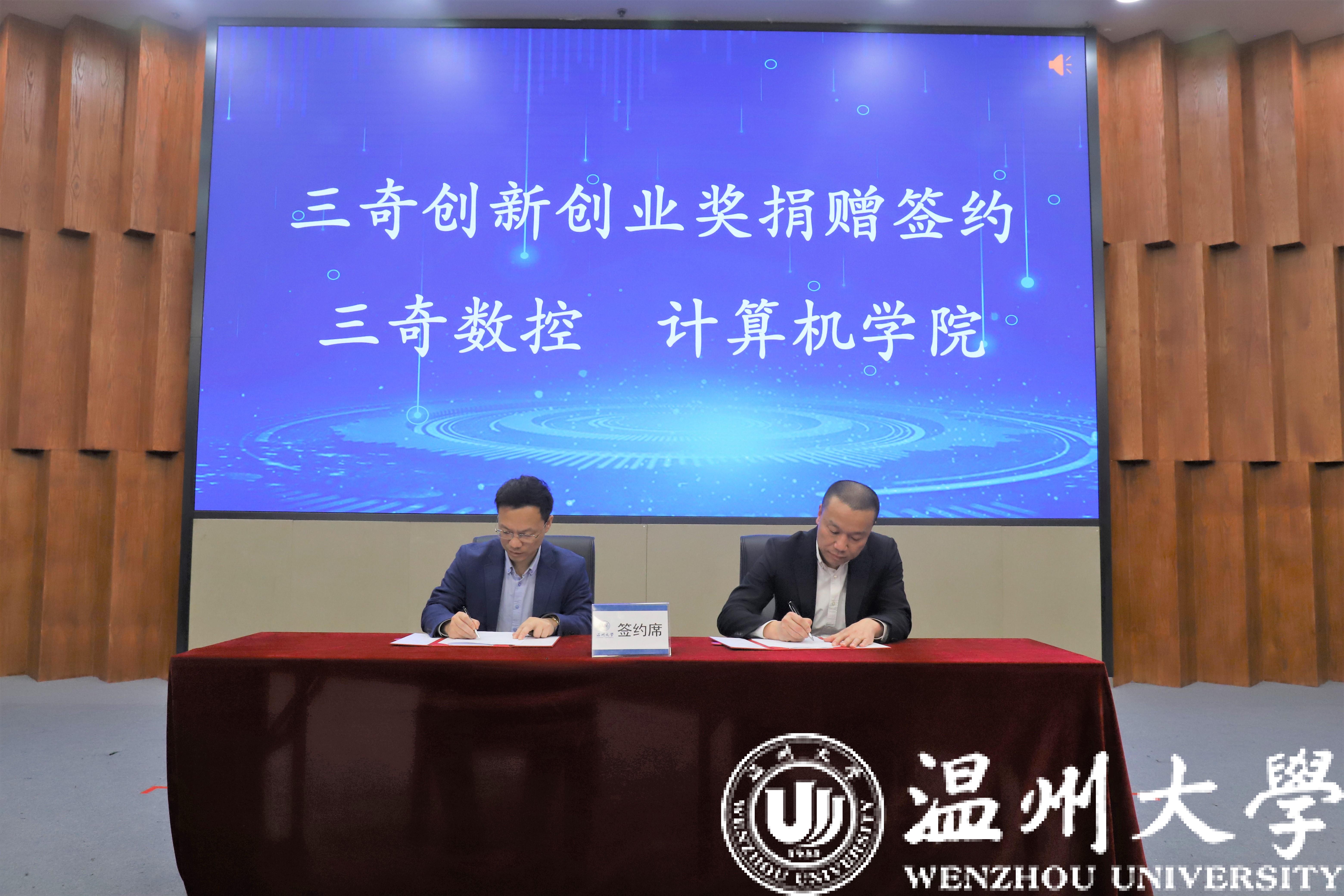 随后进行了校友基金签约仪式。为鼓励全院师生参与学科竞赛及创新创业,浙江三奇机械设备有限公司特此设立了三奇创新创业奖学金。同时,对经过学院层层筛选最后脱颖而出的三支AI创空间入驻团队设立了资助培育奖金。在为三支入驻团队颁发奖金之后,郑总发表讲话,他向同学们讲解了人工智能与大数据技术领域在工业中的实际应用,鼓励同学们大胆创新,并表达了对同学们的殷切期盼。