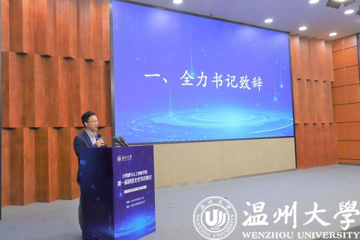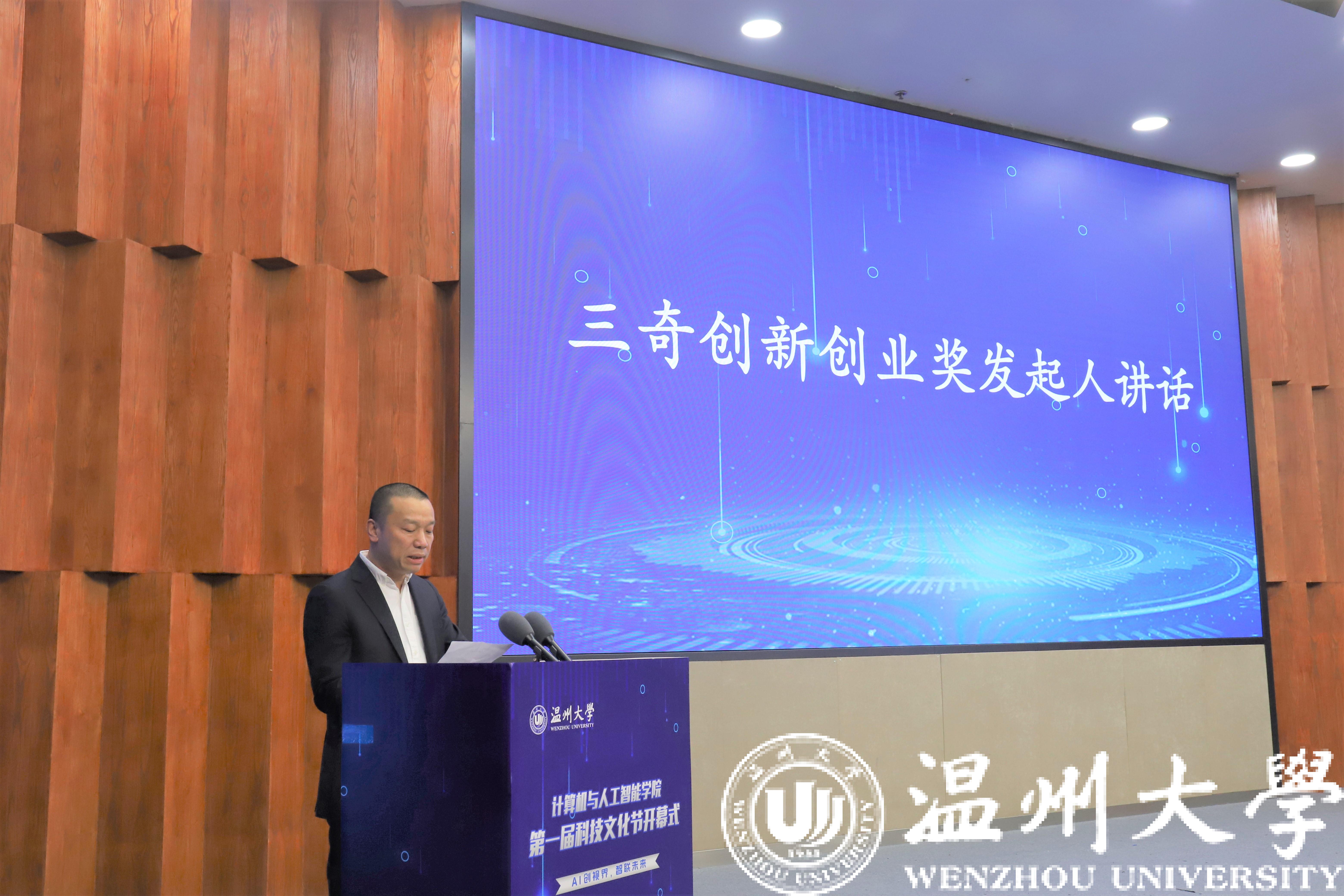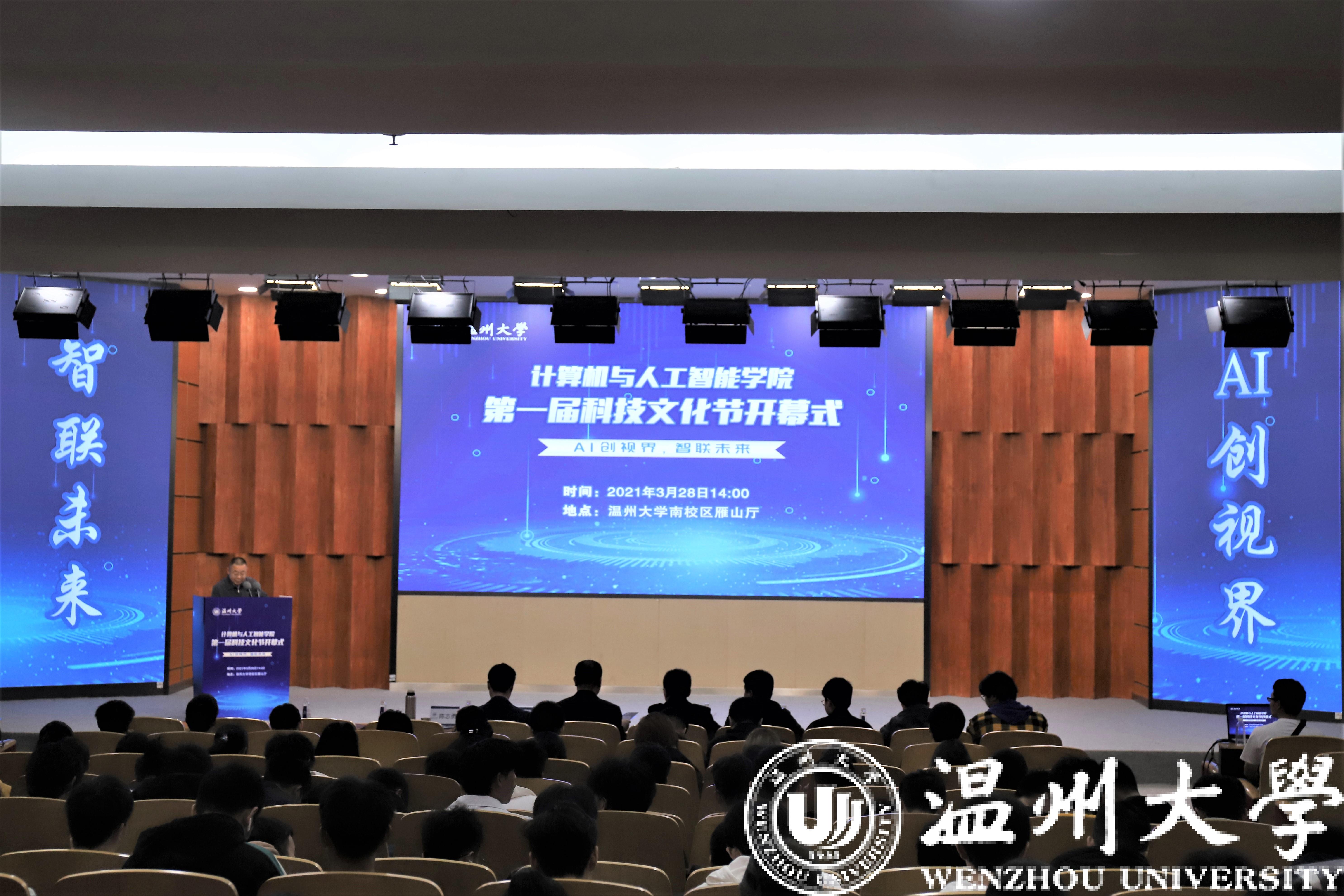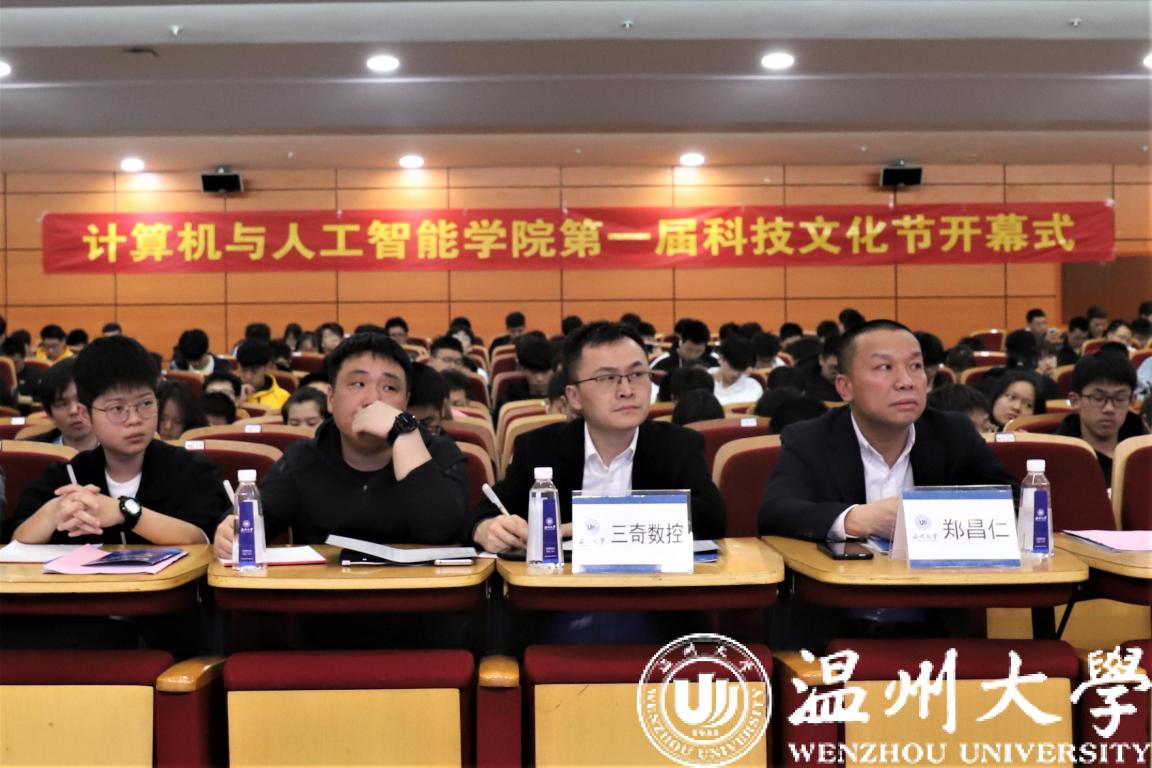 3月28日14时,beat365在线唯一官网“AI创视界,智联未来”第一届科技文化节开幕式在岩松堂雁山厅隆重举行。出席本次开幕式的嘉宾有浙江三奇机械设备有限公司总经理郑昌仁先生,温州市中津先进科技研究院王振宇院长,学院党委书记全力老师,三奇公司技术人员代表、学工办全体辅导员老师以及AI创空间入驻团队负责人们。开幕式由学院党委副书记陈志勇老师主持。
