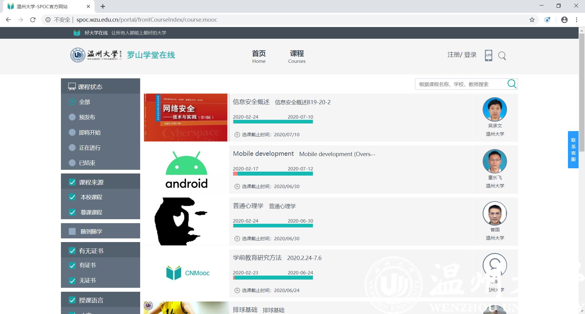 通过前期积累与本次工作的推进,本学期学院教师在温州大学“罗山学堂在线”平台上新开设19门SPOC课程,占全校本学期新开课程数的近50%,为本次线上教学的高质量开展奠定了坚实的基础。学院本学期新开设SPOC课程一览表:
