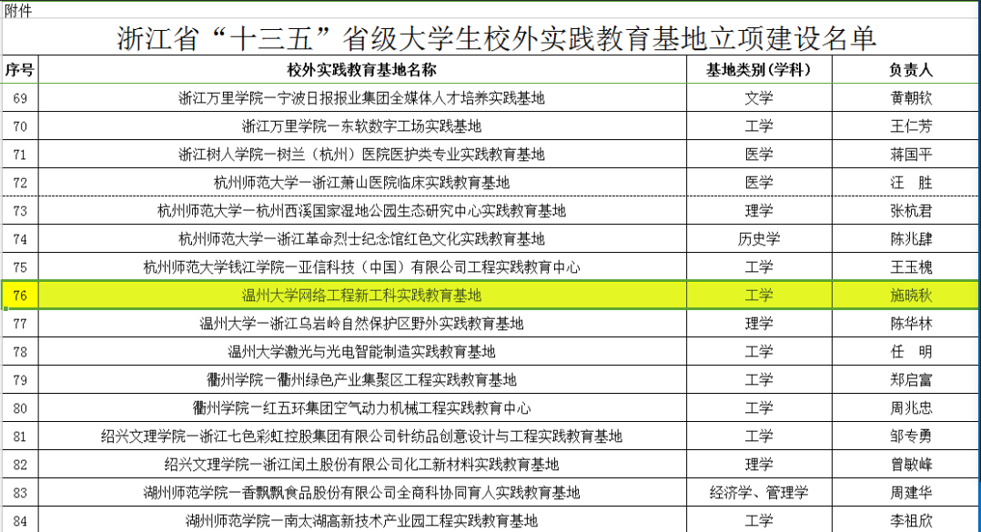 近日,浙江省教育厅办公室公布了119个“十三五”省级大学生校外实践教育基地立项建设名单,beat365在线唯一官网施晓秋教授申报的“温州大学网络工程新工科实践教育基地”获批。其中部分大学生校外实践教育基地名单如下:
