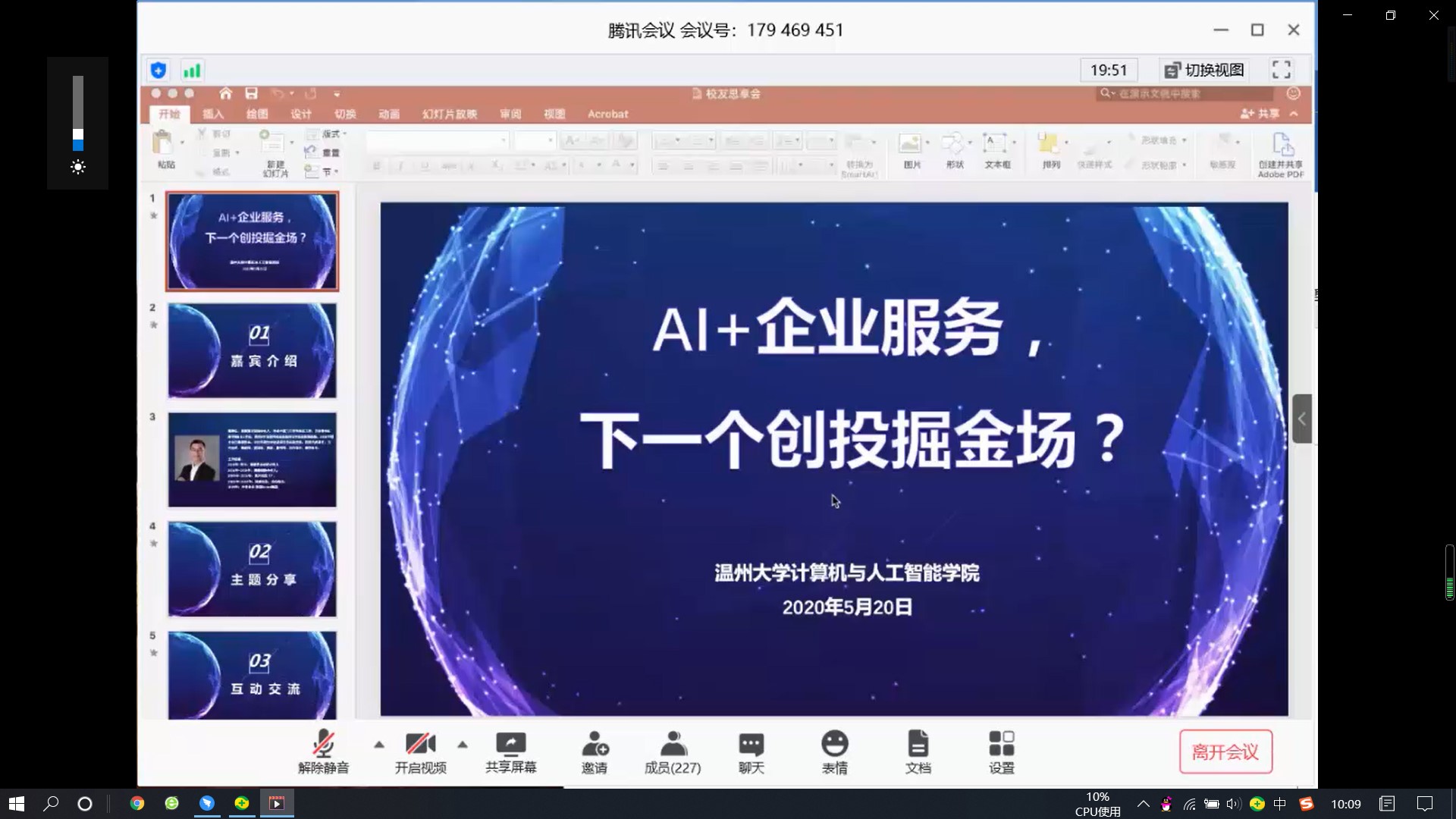 为进一步拓展同学们的眼界,深入了解互联网创业和投资等方面知识,5月20日晚,由温州大学校友发展与联络办公室、beat365在线唯一官网主办的“校友思享会——AI+企业服务,下一个创投掘金场”于腾讯会议上准时开展。本次“校友思享会”由beat365在线唯一官网党委书记全力主持,并有幸邀请到熊猫资本创始合伙人梁维弘为我校300余名师生及校友进行云分享。
