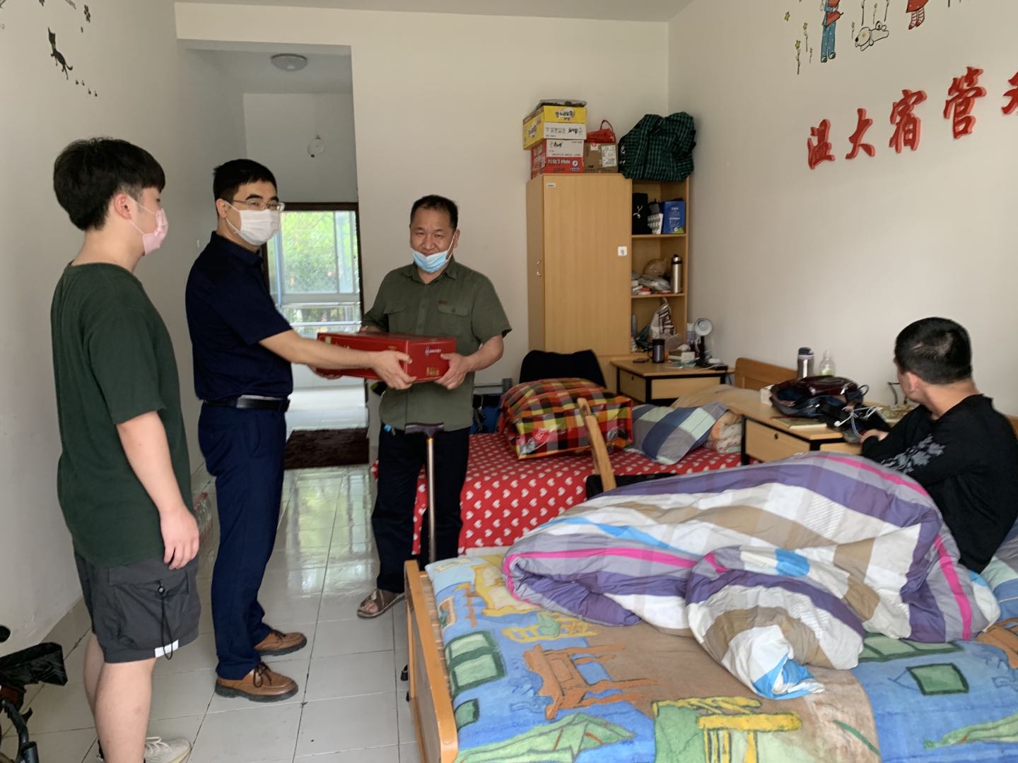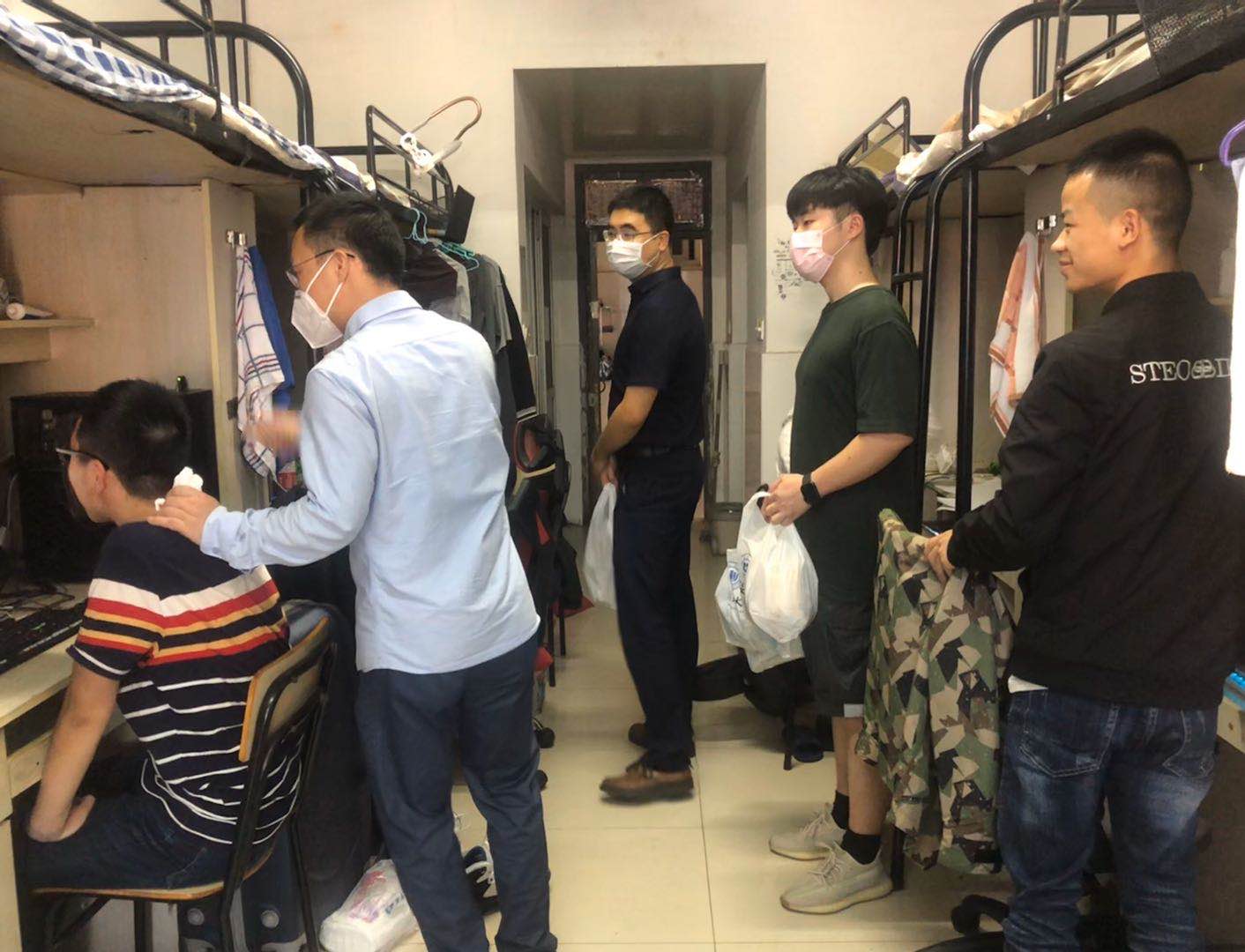 走访慰问过程中,学院领导与同学们亲切交流,主动关心同学们学习、工作、生活各方面情况,认真倾听学生心声并解答学生困惑,并为同学们分发了防疫物资。随后,学院领导叮嘱同学们疫情期间要遵守学校各项相关规定,不可放松警惕和防范意识,充分利用好学院发放给每个寝室的疫情防控物资。在校期间务必做好个人安全防护,佩戴口罩、规范洗手,每日按时进行身体健康状况上报,做到“早发现、早报告、早隔离”,同时强调做好宿舍环境卫生,勤开窗多通风 。