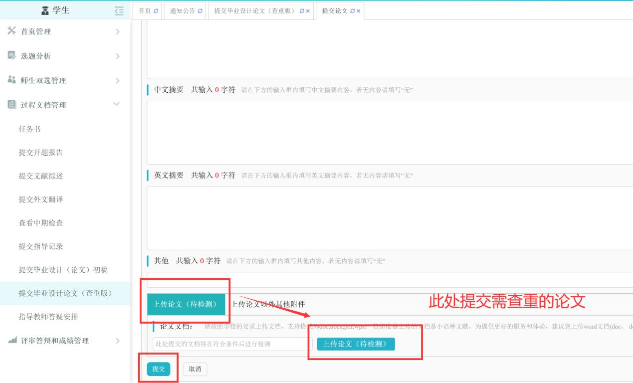 3.请学院及导师严格把关学生上传检测的论文,学校在答辩前将对上传论文进行抽检,抽检不合格的,需修改后再次送审,审查合格后方能参加答辩。 严禁各种形式的欺瞒行为,如有发现,取消答辩资格。