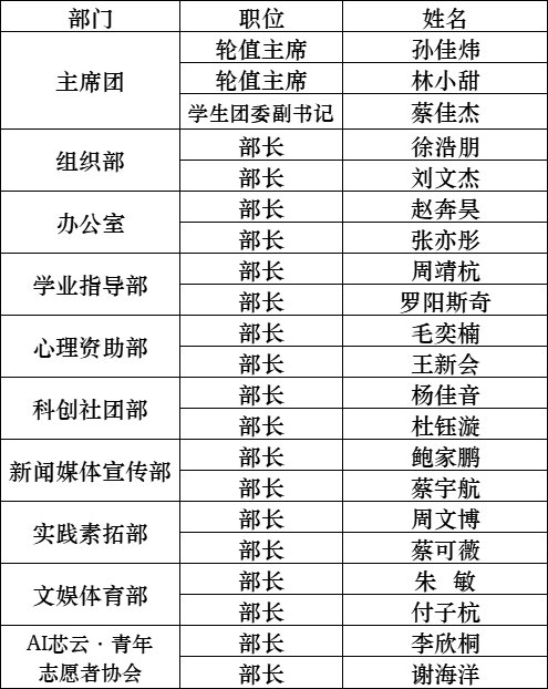 经过个人自荐、公开竞选、集体讨论等程序,经学院团委评议和研究,现将2025-2026学年beat365在线唯一官网团委·学生会学生干部(第七届)拟任名单的公示(以下排名不分先后):
