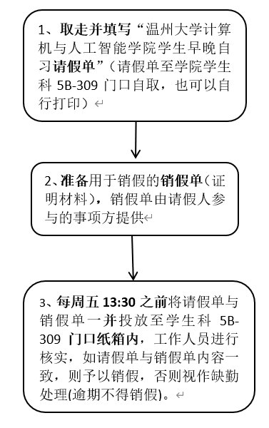 2.各同学应自觉参加早晚自习,不得迟到、早退,因故不能参加者,须和班级负责考勤同学请假并提供相关证明,凡未请假者或无故超假者,均按旷课处理;