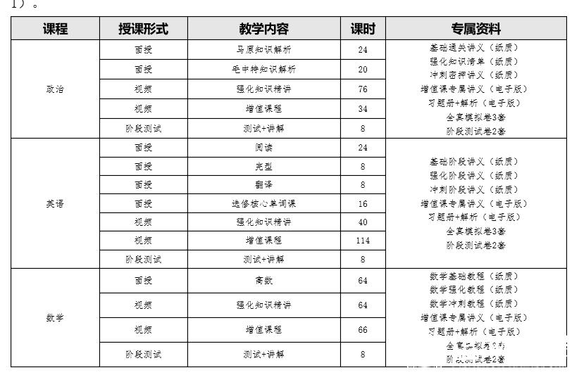 暑期课程培训采用现场授课的教学形式,授课课程包括政治、英语、数学(详见附件1)。
