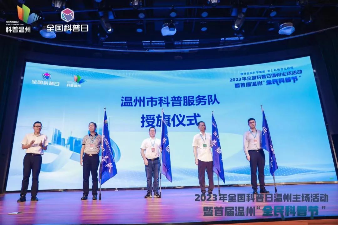 现场还举行了科普服务队授旗仪式,温州大学、国科温州研究院、正泰集团股份有限公司、温州市海外科技工作者协会他们将发挥各自科普资源优势,面向中小学、社区、机关单位等积极开展丰富的科普活动。