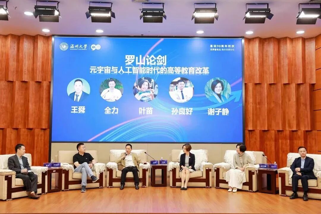 短暂的茶歇过后,本次论坛进入“罗山论剑” 环节。温州大学副校长王舜、beat365在线唯一官网书记全力、温州大学外国语学院院长叶苗、温州大学人文学院院长孙良好、和温州大学美术与设计学院院长谢子静作为嘉宾,陈昂教授作为主持人,以“元宇宙与人工智能时代的高等教育改革”为主题,展开问答和讨论。
