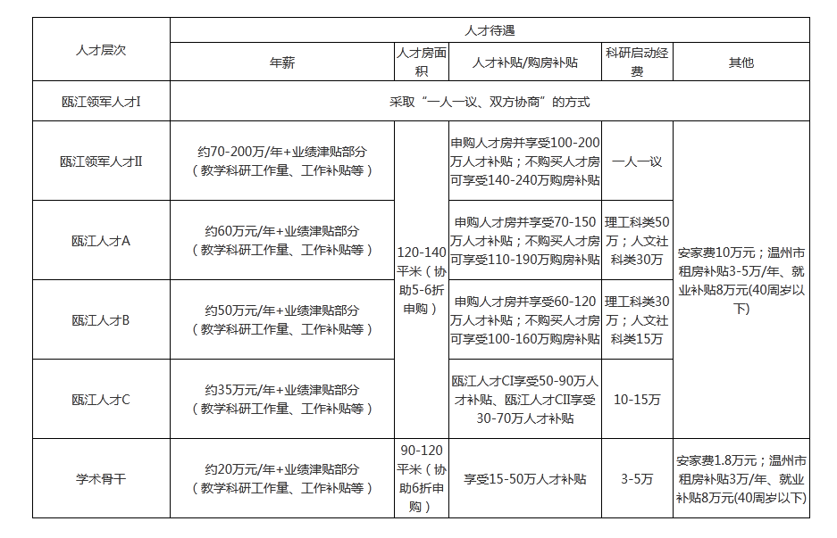 1、人才层次依次为:瓯江领军人才(I、II),瓯江人才A,瓯江人才B,瓯江人才C(C1、C2),学术骨干(I、II、III、IV);各层次人才要求及待遇参见附件1-6。