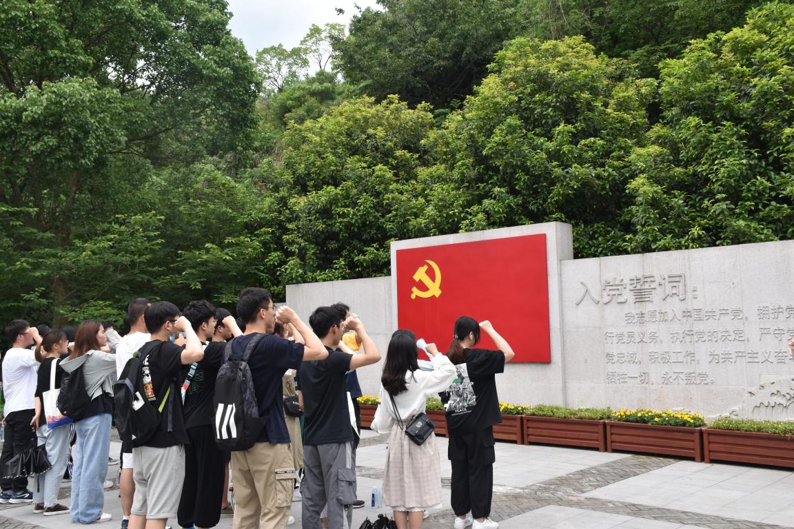 随后,党员们和入党积极分子们随着讲解员来到中共浙江省一大陈列馆。“我志愿加入中国共产党...在宣誓墙前,徐梦瑶同学带领所有党员以及积极分子面对党旗,重温入党誓词,铭记光辉历史,大家在党旗下接受心灵的净化和洗礼。