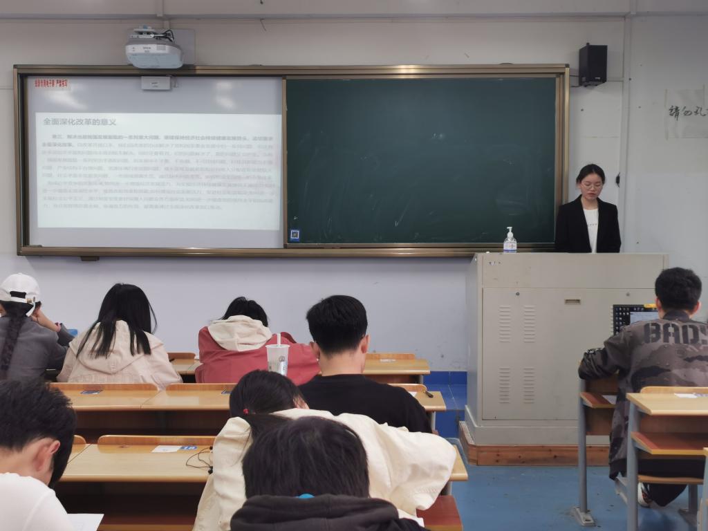首先,张巧凤同学通过介绍全面深化改革总目标“完善和发展中国特色社会主义制度、推进国家治理体系和治理能力现代化”以及其提出背景,让同学们深刻认识到了全面深化改革总目标的重要性。随后,张巧凤同学通过一段视频为同学们展示了全面深化改革五年来的主要成就,让同学们感受到了举国上下越梗阻、闯险滩,换来的百舸争流、千帆竞发的宏阔气象。