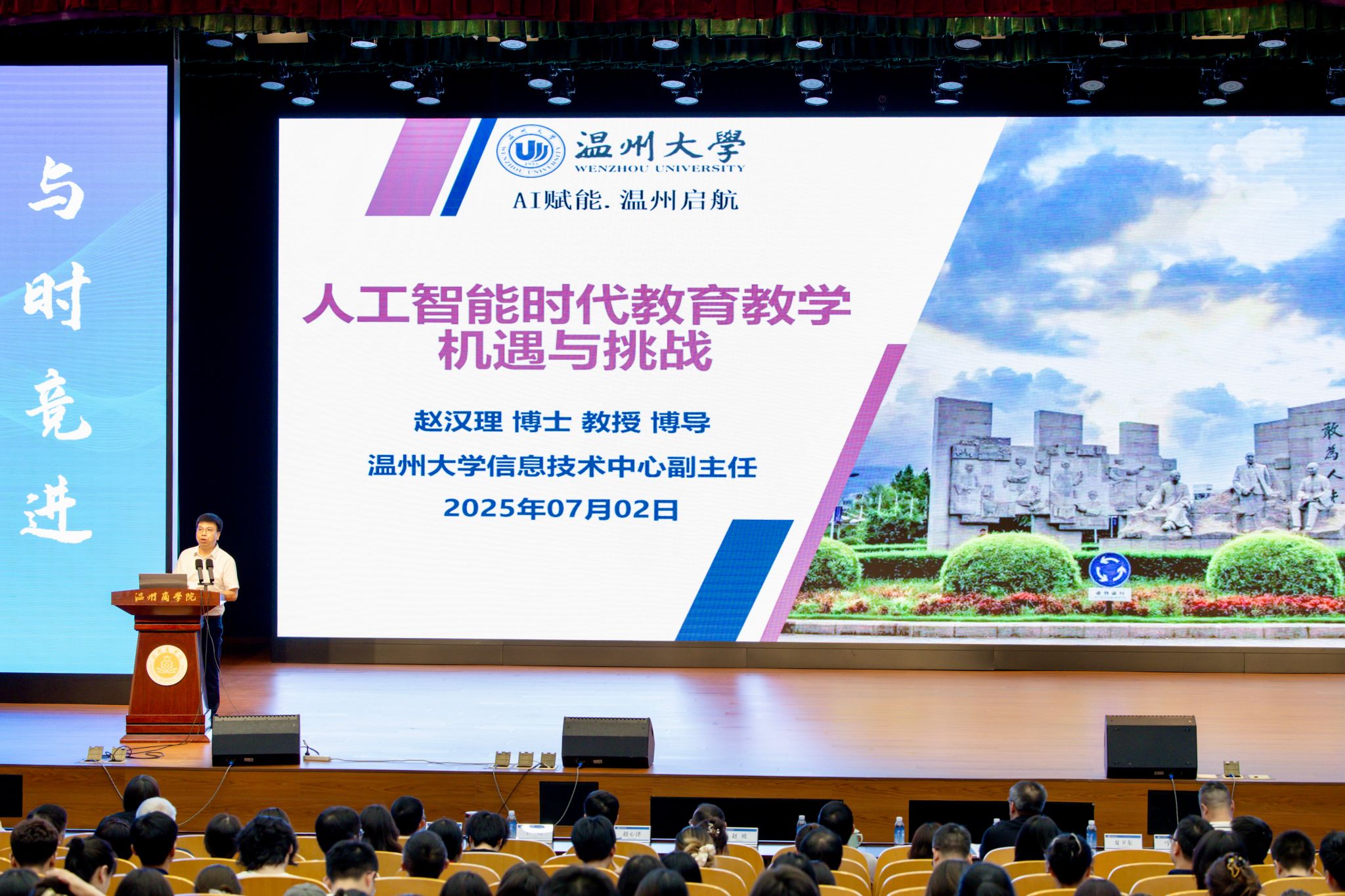 7月2日下午,我校举行人工智能赋能教育培训启动会。此次培训旨在促进人工智能技术与教育教学深度融合,助力提升全校教职工人工智能素养与应用能力。全体校领导、全体中层干部、全体教职工参加培训会,副校长白彦主持并部署暑期全员培训工作。会上,温州大学信息技术中心副主任赵汉理教授以《人工智能时代教育教学机遇与挑战》为题作专题培训讲座。他从人工智能技术现状切入,深入浅出地阐述了AI发展历程与技术原理,全面解读AI给教育领域带来的机遇与挑战,...